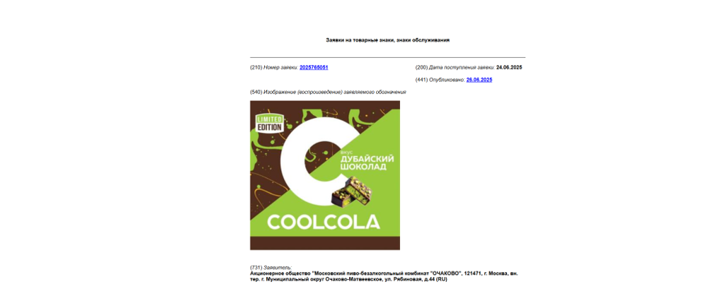 COOLCOLA со вкусом дубайского шоколада: «Очаково» регистрирует новый товарный знак