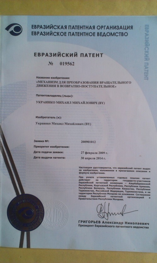 Евразийский патент № 019562. F16H 19/04. Выдан 30.04.2014.