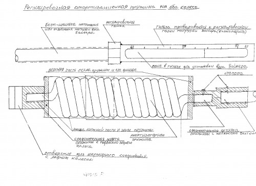 В связи с работой амортизатора (п.4) на два колеса велосипеда пружина изготовлена из того же металла, что и ранее используемая для амортизации заднего колеса. Но если ранее используемая пружина состояла из 5-6 витков и работала на сжатие, то новая усиленная пружина работает на растяжение и состоит из 15-18 витков (фиг.3), точное количество которых зависит от назначения велосипеда детский, подростковый, взрослый или спортивный. Это и позволило усилить амортизатор, обеспечив его работу на два колеса.