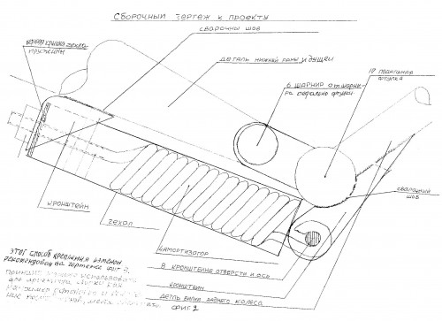 Используя описанную выше известную конструкцию, автором было решено связать эти две подвижные части велосипеда (фиг.2 - исходная конструкция велосипеда), соединив их единственным пружинным амортизатором фиг.3, фиг.4, фиг.5 (п.4), что позволило шарнирно соединить переднее и заднее колесо, но не непосредственно с амортизаторами, а через два устройства, которые действуют как рычаги фиг.3 (п.8 и п.9), что способствует работе амортизатора (п.4) и делает его более чувствительным при наезде на препятствия, встречающиеся на дорогах. Амортизатор (п.4) крепится при помощи кронштейнов фиг.3, фиг.7 (п.5 и п.7), приваренных к нижней наклонной раме (п.8) снизу. Крепление амортизатора (п.4) осуществлено так, что верхний его конец крепится к передней части, при помощи прямого конца пружины, который заканчивается резьбой и проходит через отверстие в кронштейне, а на выходе навинчивается регулировочной гайкой фиг.3 (п.2). Нижний конец амортизатора (п.4) крепится при помощи кольца образованного нижней частью пружины, который заходит в двойные проушины нижнего кронштейна (п.7) и крепиться штифтом шарнирно. Сам кронштейн крепится на сварке к вилочной раме заднего колеса (п.9).