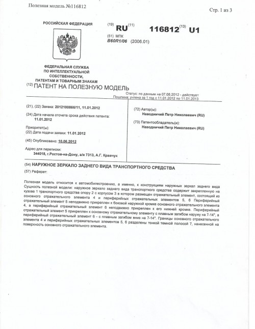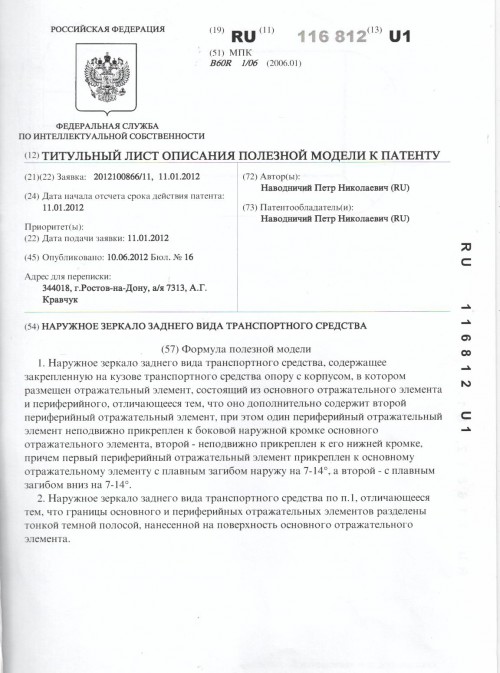 1. Наружное зеркало заднего вида транспортного средства, содержащее закрепленную на кузове транспортного средства опору с корпусом, в котором размещен отражательный элемент, состоящий из основного отражательного элемента и периферийного, отличающееся тем, что оно дополнительно содержит второй периферийный отражательный элемент, при этом один периферийный отражательный элемент неподвижно прикреплен к боковой наружной кромке основного отражательного элемента, второй - неподвижно прикреплен к его нижней кромке, причем первый периферийный отражательный элемент прикреплен к основному отражательному элементу с плавным загибом наружу на 7-14°, а второй - с плавным загибом вниз на 7-14°.