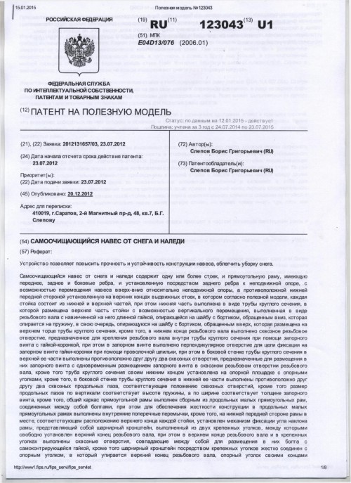Плоский, прямоугольный навес – можно рассматривать как половину крыши состоящую из двух одинаковых частей. На основе патента RU-123043-U1, можно разрабатывать технику подъема всей крыши под разными градусами к центральной оси. Рис – 1, 2, 3, 4, 5. Если верхний угол крыши будет 800 – 600 градусов и ниже, то снег на крыше лежать не будет. Он будет постоянно скатываться вниз по крыше в легком состоянии, не представляя никакой опасности людям внизу. Таким образом весовой нагрузки от снега на такую крышу почти не оказывается и ее можно сделать тонкой, легкой и прозрачной. Под ней можно сделать на чердаке летнее мансерадное помещение, освещенное естественным светом. Такие крыши бывают раздвижные, сдвижные, передвигающиеся, съемные, ломанные, раскрывающиеся. Эта крыша-навес по патенту – раскрывающиеся, имеет особенность, на ней не образуются наледи, сосульки, льдины, так как нет снега, он сползает вниз, остается убирать его внизу на земле. Современные материалы и нано технологии дают возможность изготавливать легкие, прочные, тонкие и прозрачные крыши-навесы передающие больше света в помещение.