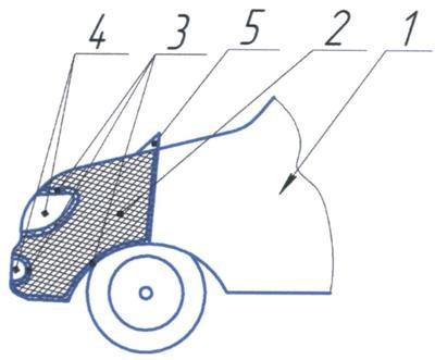 1. Устройство для защиты передней части автотранспортного средства от дисперсных частиц и насекомых, содержащее полимерную или металлическую сетку, средства крепления к передней части автотранспортного средства, отличающееся тем, что сетка соединена с ребрами жесткости, расположенными по внешнему контуру сетки, по контурам фар, номерного знака и решетки радиатора.