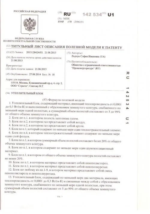 Пустотельный утеплитель защищен патентом на полезную модель (№ 142534 до ). Возможна продажа патента.