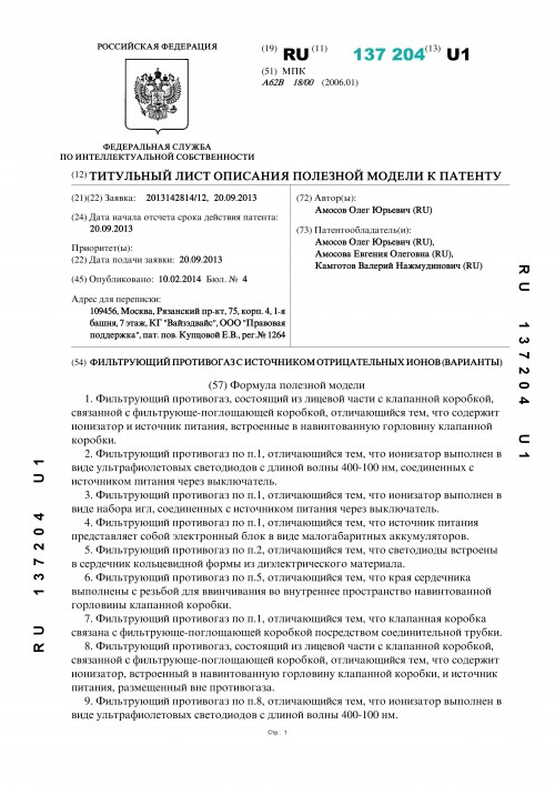 Полезная модель относится к средствам индивидуальной защиты органов дыхания человека и направлена на улучшение физиолого-гигиенических характеристик фильтрующего противогаза посредством насыщения вдыхаемого воздуха отрицательными ионами кислорода, устранение "аэроионного голодания", улучшение работы всех функциональных систем организма человека: увеличение трудоспособности, снижение физической и умственной усталости, уменьшение частоты дыхания и сердечных сокращений, повышение концентрации внимания, улучшение общего состояния. Указанный технический результат достигается по первому варианту выполнения фильтрующего противогаза тем, что содержит ионизатор и источник питания, встроенные в навинтованную горловину клапанной коробки, а по второму варианту тем, что содержит ионизатор, встроенный в навинтованную горловину клапанной коробки, и источник питания, размещенный вне противогаза. 2 н.п. и 14 з.п. ф-лы, 8 ил.