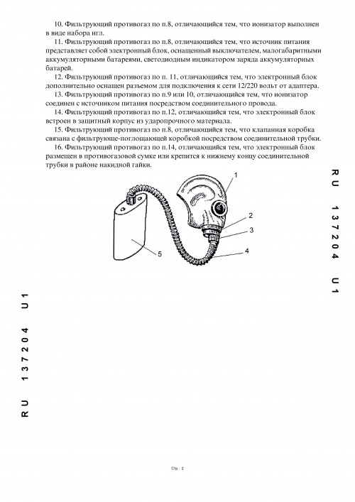 Технический результат, достигаемый при реализации данной полезной модели, заключается в улучшении физиолого-гигиенических характеристик фильтрующего противогаза посредством насыщения вдыхаемого воздуха отрицательными ионами кислорода, устранении "аэроионного голодания", улучшении работы всех функциональных систем организма человека, в частности: