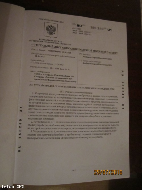 паент на полезную модельустройство дя ступенчатой очистки газообразных и жидких сред