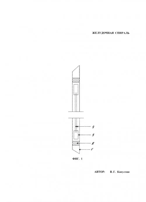 Желудочная спираль, состоящая из герметично закрытого с обеих сторон зонда, отличающаяся тем, что зонд в виде гибкой трубки и закупоривающие пробки выполнены из эластичного, термолабильного и апирогенного силикона, двумя нитиноловыми проволоками с изначально заданной формой в виде спирали, имеющими на концах защитные полиэтиленовые наконечники диаметром сечения 1,25 мм, длиной 870 мм, причем трубка имеет толщину стенки 2,5 мм, наружный диаметр 8 мм и длину 960 мм.