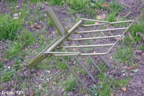 Затем также как при обычном перекапывании земли лопатой, ногу ставят на вилы 3 устройства и давят на вилы до тех пор, пока U-образная опора и гребенка-рыхлитель не упрутся в землю.