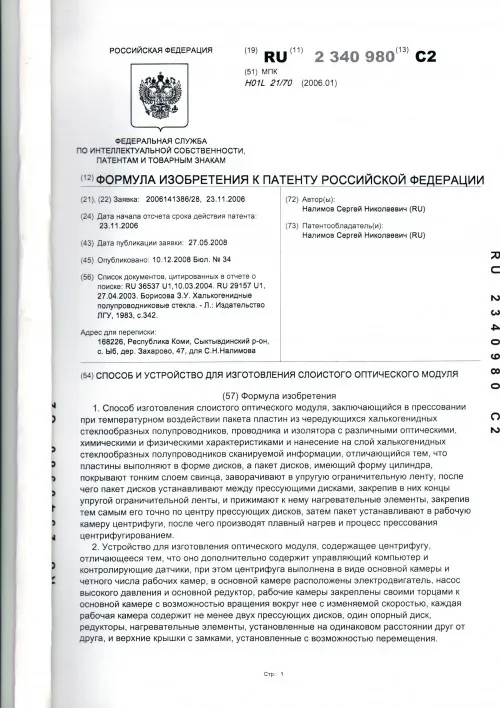 Вышеуказанный технический результат достигается за счет того, что в способе изготовления слоистого оптического модуля, заключающемся в прессовании при температурном воздействии пакета пластин из чередующихся халькогенидных стеклообразных полупроводников, проводника и изолятора с различными оптическими, химическими и физическими характеристиками и нанесении на слой халькогенидных стеклообразных полупроводников сканируемой информации, пластины выполняют в форме дисков, а пакет дисков, имеющий форму цилиндра, покрывают тонким слоем свинца, заворачивают в упругую ограничительную ленту, после чего пакет дисков устанавливают между прессующими дисками, закрепив в них концы упругой ограничительной ленты, и прижимают к нему нагревательные элементы, закрепив тем самым его точно по центру прессующих дисков, затем пакет устанавливают в рабочую камеру центрифуги, после чего производят плавный нагрев и процесс прессования центрифугированием.