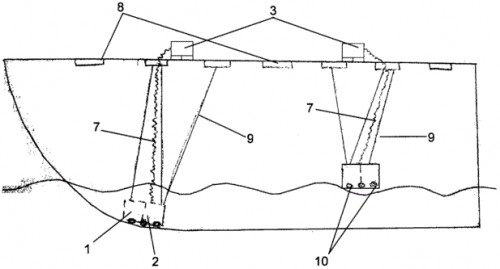 Для уменьшения размеров эластичные емкости («ковры») должны складываться различными способами - в виде гармошки, трансформера и т.д., для легкого проникновения в танкер через технологические отверстия. Подвод емкостей к пробоине осуществляется гравитационно-механическим путем и комплектацией емкостей расчетным грузом 10 снизу и пронумерованными, и размеченными по длине канатами 9, и телескопическими шестами (не показано).