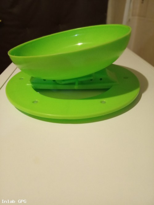 Тарелка состоит из двух частей чаши и платформы с присосками .Чаша крепится к платформе при помощи фиксирующей скобы через технологические отверстия в платформе и в чаше, при помощи которых можно регулировать расстояние чаши от края стола и наклон чаши с фиксацией её от себя и на себя для доедания остатков пищи. Может быть использована для кормления детей, для развития моторики ,обучению этикету ,а также для лиц с болезнью Паркенсона, людей имеющих одну  верхнюю конечность ,пристарелых .