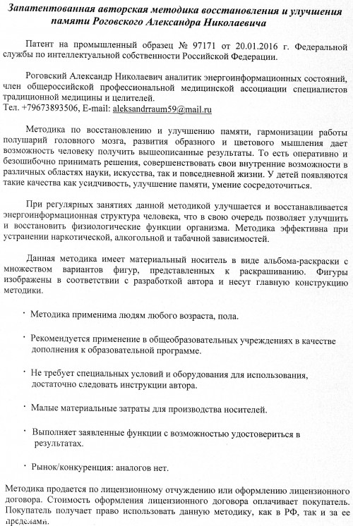 МЕТОДИКА ПО ВОСТАНОВЛЕНИЮ И УЛУЧШЕНИЮ ПАМЯТИ, ГАРМОНИЗАЦИИ РАБОТЫ ПОЛУШАРИЙ ГОЛОВНРГО МОЗГА,РАЗВИТИЯ ОБРАЗНОГО И ЦВЕТОВОГО МЫШЛЕНИЯ ДАЕТ ВОЗМОЖНОСТЬ ЧЕЛОВЕКУ ПОЛУЧИТЬ ВЫШЕОПИСАННЫЕ РЕЗУЛЬТАТЫ.