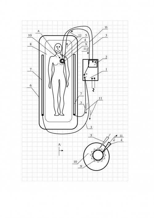 Предложенная автором конструкция элементов электрохимической системы для воздействия катодным током на вирус иммунодефицита ВИЧ в организме человека относится к области медицинской электротехники, может быть использована для лечения ВИЧ-инфицированных больных. Задача заключается в  локализации  в крови ВИЧ инфицированного человека  содержащихся в видоизменённом белке  положительно заряженных ионов водорода (Н+) и  преобразования их  в молекулы водорода. Задача решается за счет использования конструкции элементов электрохимической системы воздействия катодным током  на видоизменённый белок. Признаки изобретения:  применение стационарного  преобразователя  переменного тока в постоянный ток (для 1-ого варианта), блока питания  постоянного тока, который можно закрепить на руке больного (для 2-ого варианта), анодного углеграфитового электрода подключённого к положительной шине  внешнего источника и  помещенного в ванну с электролитом в которой располагается человек (для 1-ого варианта), анодных углеграфитовых электродов, подключённых к положительной шине  внешнего источника,  расположенных в пористом материале пропитанном электролитом и закрепленных пластырем  на спине вдоль позвоночника (для 2-ого варианта),  графитового катодного электрода подключённого к отрицательному шине   внешнего источника  и включённого  в вену на участке малого круга кровообращения после  прохождения крови через легкие,  автоматического датчика температуры для регулировки  выходного катодного тока  относительно температуры  крови человека,  находящегося в интервальном режиме  37-39  ̊С.На катодный электрод от  преобразователя / ЭДС будут поступать электроны, которые аккумулируются на двойном электрическом слое, а также  будет происходить транспортирование водородных ионов  из крови человека к поверхности катода (т.е. к двойному электрическому слою). На двойном электрическом слое катода  будет происходить реакция: H+  + е-   -> H , т.е. образование молекулы водорода. Технический результат- очищение крови от ВИЧ. Сайт изобретателя buslay-patent. com