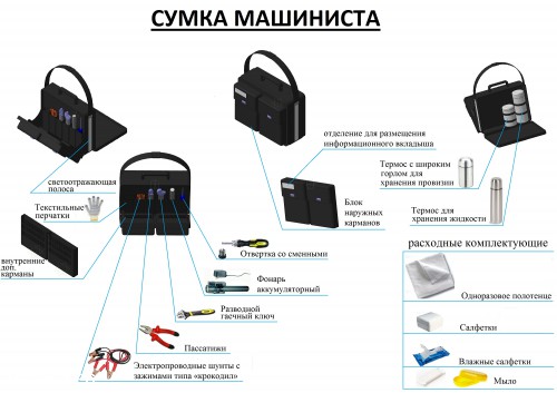 На основании вышеизложенного член локомотивной бригады должен иметь при себе все необходимые средства для выполнения поставленных задач. В качестве данного средства выступает сумка машиниста, включающая в себя необходимый комплект оборудования и инструментов, а так же имеющая отдельные отсеки для размещения документов и инструкций.