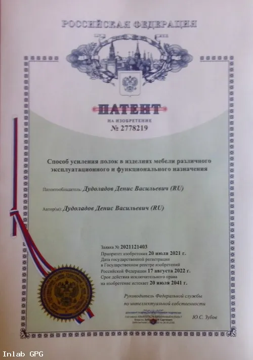 2.                 Способ усиления полок по п.1, отличающийся тем, что на заключительном этапе изготовления мебельного изделия устанавливают фронтальную(ые) вертикальную(ые) грань(и) – фасад(ы) мебельного изделия в виде распашной(ых) двери(ей) с вертикальной или горизонтальной осью вращения, двери(ей) с механизмом(ами) выдвижения, раздвижения или трансформации, ящика(ов), полуящика(ов) из МДФ с защитно–декоративным покрытием, влагостойкой(их) или невлагостойкой(их) ЛДСП твердых пород древесины. №2778219, приоритет установлен по дате от 20.07.2021 г.