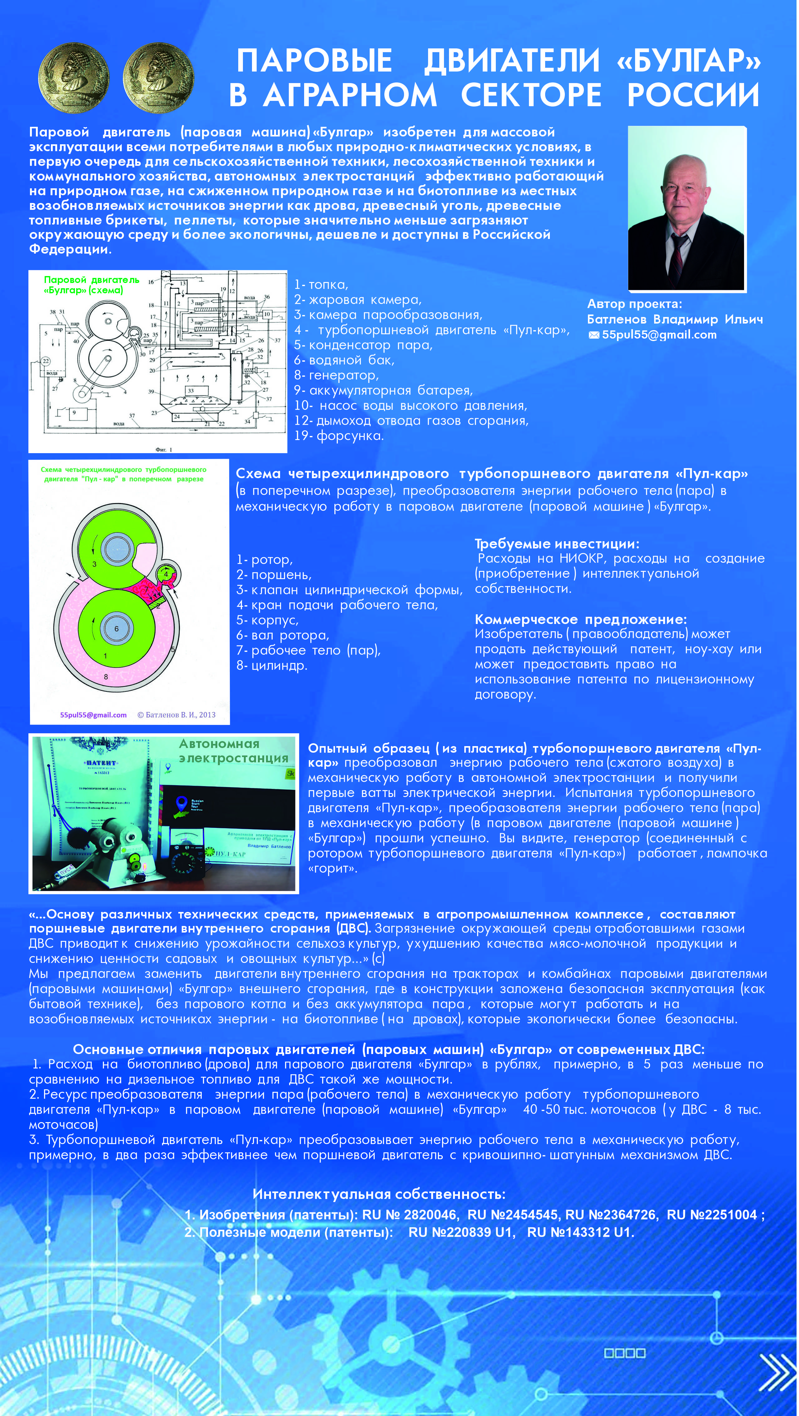 1. Создание паровой машины эффективно работающей при низком давлении пара до 10 кг/см2 и температуры пара до 300°С.