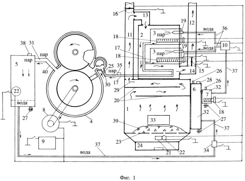 Фиг. 1, где: 1- топка, служит для преобразования химической энергии топлива в тепловую, которую используют для получения пара, производят теплоизоляцию стенок топки огнеупорным материалом;