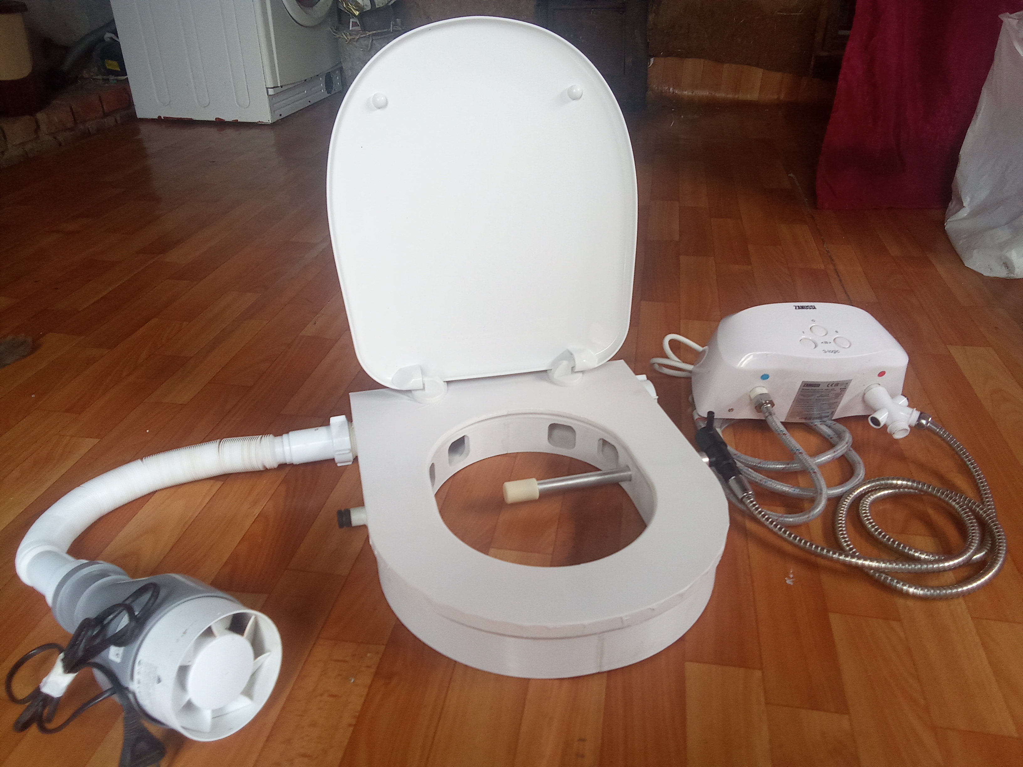 Устройство устанавливается на унитаза вместо седушки это и есть седушки полая внутри с отверстиями внутрь унитаза снаружи есть резьба для шланга который соеденен с вентиляторором который вставлен в отверстие в вентиляционную шахту при включении вентилятора воздух с унитаза через шланг удаляется в шахту  также в устройстве расположена трубка которая внутри унитаза соеденена с лейкой а снаружи с краном и шлангом который подключен к водонагревате получается биде на унитазе при надобности  лейка от стенки выдвигается на середину краном регулируется подача теплой воды небольшим поворотом трубки струи подаются под разным углом  после процедуры лейка убирается к стенке. Устройство выполняет две функции убирает запах прямо с унитаза и выполняет функцию биде   все устройство делается из пластика остальное шланги вентиля